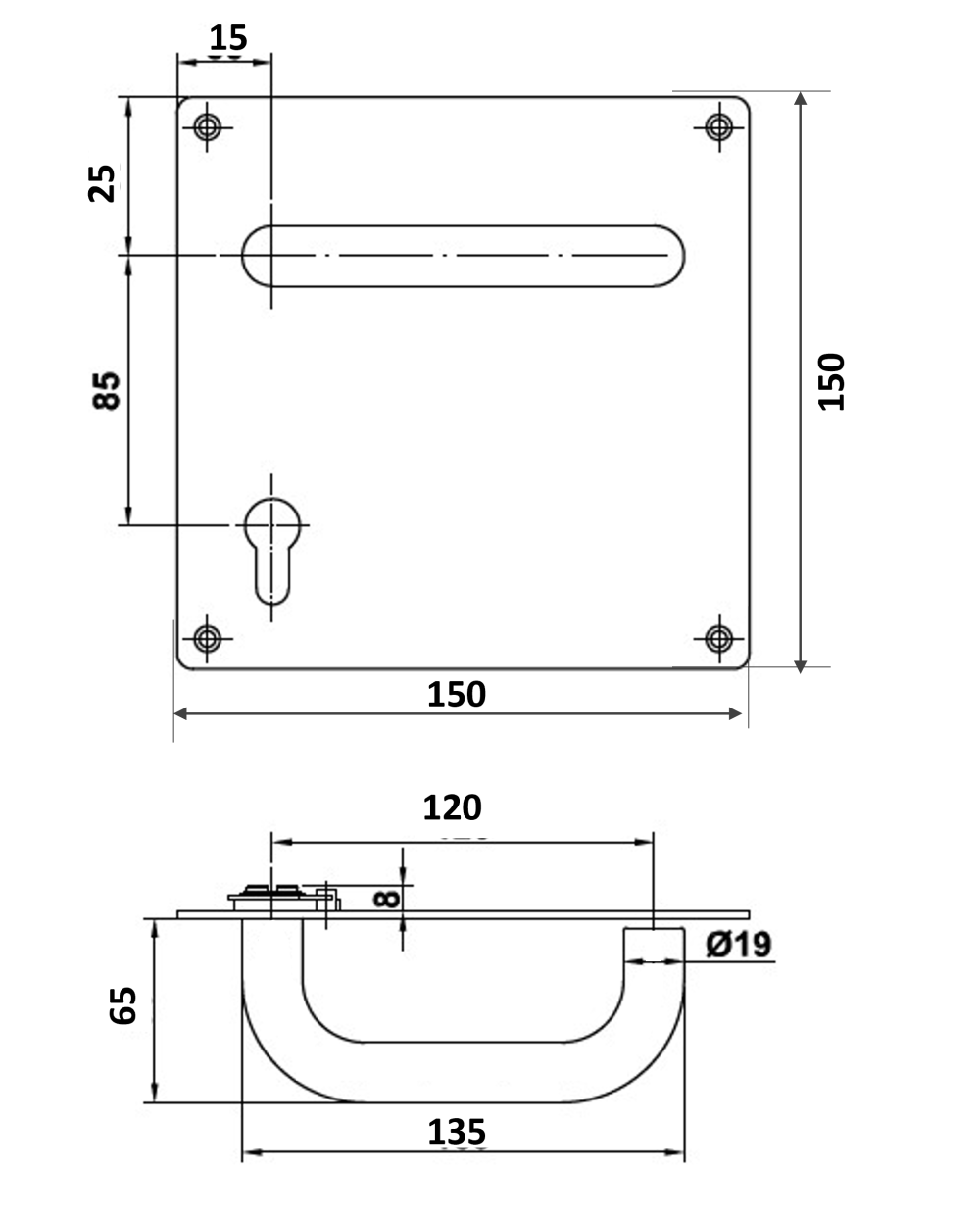 MEDIDAS: Placa: 150mm x 150mm Manilla Tubular: 65mmx135mmx19Ø 85mm entre ejes